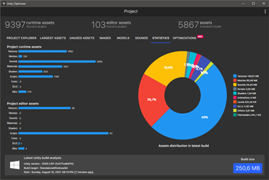 - Very easy to use ! - Works well with Unity 2018, 2019, 2020 and 2021 for 2D and 3D projects - Works for all build targets (Win, MacOs, Linux, IOS, Android...) - 2 possible project analysis (basic analysis or in depth analysis) - Basic analysis will analyse all your project assets - In depth analysis will open all images, 3D models and sounds assets to analyse their content - Check asset info (size, usage, included in build...) in asset explorer - Fast overview of the largest assets in your project - Fast overview of the assets that are not used but included in your build - Deep overview of the heaviest images (in depth analysis) - Deep overview of the heaviest 3D models (in depth analysis) - Deep overview of the heaviest sounds (in depth analysis) - Get statistics about the asset type distribution (textures, sounds, 3D models, scripts...) - Get a list of all possible optimizations that can be made reduce the size of your build - Export optimizations list to Excel or CSV