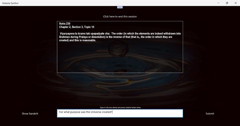 This Synthor lets you interact with the Vedanta. The Vedanta (or Brahma Sutras) are among the most influential philosophical texts from ancient India. The german philosoper, Schopenhauer said, "There is no religion or philosophy so sublime and elevating as Vedanta." And the famous poet T.S.Eliot said, "A good half of the effort of understanding what the Indian philosophers were after - and their subtleties make most of the great European philosophers look like schoolboys." But the Vedanta is not an easy read, not the kind you would read at one go. This Synthor solves that problem by allowing you to interact with the Vedanta, ask it questions and submit comments to it. The Vedanta Synthor will present the relevant lines in response to queries and you can see the original Sanskrit text as well....