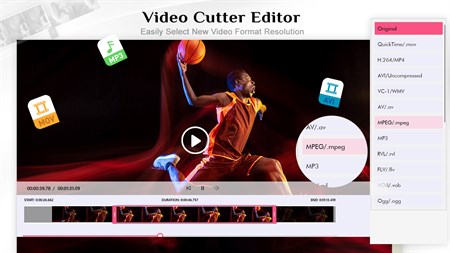 Video Cutter Editor cuts your video in easy steps and save the file immediately. Supported video formats MOV, MP4, AVI, WMV, AV, MPEG, MP3, RVL, FLV, VOB, OGG, MKV, AMV, 3GP, M4P, MPG, MP2, MPE, M2V, M4V, 3G2.