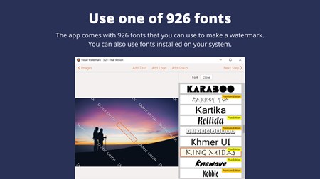 Our toolkit has everything to create watermarks of different styles to match the mood of your images. You can add multi-lined text, upload your own logo or choose one of our 60 built-in icons that will fit the needs of photographers, real-estate agents, shops, restaurants, and transportation companies. Visual Watermark also offers 10 group templates that combine both text and logo. You can experiment with various fonts as our diverse library includes up to 1000 of them. Plus, all the fonts that you install on your computer will show up in Visual Watermark automatically. The app allows you to add a copyright symbol, file name, date, or description from EXIF, sequential numbers, and a few other things to your text. The color section offers a set of 22 popular colors and the color wheel, with the help of which you’ll be able to select the right hue; it is even possible to type in a hex color code if you know it. You can change the size of your watermark as well as its level of opacity, rotate it, then jazz it up with one of our effects, among which you’ll find drop-shadow, boxy backgrounds, and eye-catching gradients.