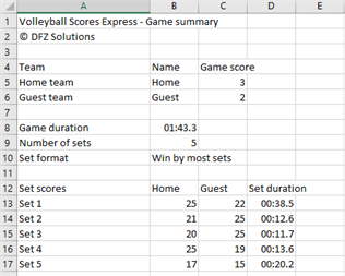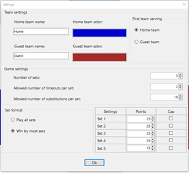 * Define custom team names and their colors * Choose the game format: play all sets or win by most sets * Configure the number of sets in a game * Individually configure the number of points per set and if a cap is applicable * Specify which team serves first * Reset the set in progress or the entire game * Override the current team serving * Configure the maximum number of timeouts and substitutions allowed per set * Keep track of your timeouts and substitutions * Undo points (tap and hold or right-click) * Swap sides of the court, anytime, as needed * View the final scores for all sets played * Copy a summary table of game results and paste it in your preferred spreadsheet software