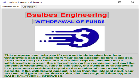 This program can help you if you want to determine how long withdrawals can be made from your bank account before it expires. The data to be provided are: the initial deposit, the number of withdrawals in a year, the interest rate on the remaining part and the amount of withdrawals. Also in this case, the number of withdrawals in a year was considered equal to the number of compounding periods. If the withdrawal amount is less than the interest paid, your account will grow rather than expire: the message will then appear BANK BALANCE is GROWING.