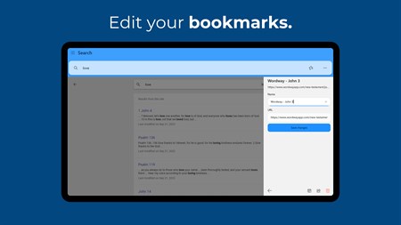 Features: - Resume your searches. - Customize your search experience. - Customize your home page. - Choose from five different Bible search engines. - Add and edit your favorites. - Automatically save your favorites. - Bounce between searches using Multitask. - Create your own queries and customize their icons. - Share your data with others. - Backup and restore your data. - Customize the background of your app.