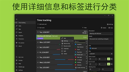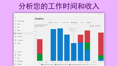 • 全平台支持:包括桌面端和移动端及多平台云同步(OneDrive/Google Drive/Dropbox/iCloud/WebDAV)* • 通过独特的通知和地理围栏功能轻松记录你的工作时间 • 每一个时间块都可以自由编辑,一切由你掌控 • 轻松为时间块分配任务或标签,一切井井有条 • 以 Excel 或 CSV 文件形式导出数据,轻松管理数据* • 到达/离开工作地点时自动启动/停止工作计时,解放你的双手 • 通过自定义标签记录工作时间和收入 • 通过标签和任务筛选特定时间块 • 通过图表分析工作时间和收入,直观明了 • 集成系统日历:在软件中显示你的日程,并迅速将其转化为跟踪的工作时间 • 使用番茄工作法提高工作效率— WorkingHours 时间块会在你完成一个工作部分时提醒你