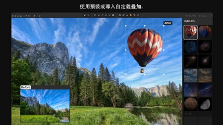 • 疊加 - 導入自定義疊加並添加人造光、神光、水反射、光暈效果、漣漪、復古、令人驚嘆的背景等效果。