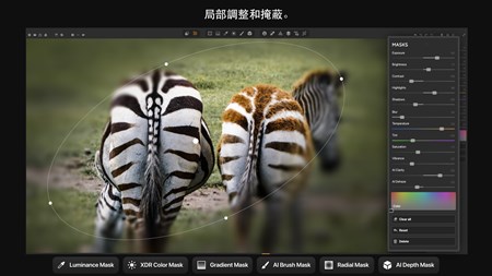 • 局部調整。使用蒙版和畫筆進行局部更改。應用徑向、漸變、畫筆、亮度、深度蒙版。在選定區域中插入自定義覆蓋。