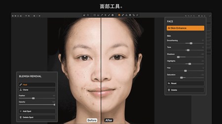 擴展功能 - 編輯 RAW 圖像 - 透視和仿射(拉直),梯形校正 - 網格變形 - 平滑度和手動恢復 - AI 工具 - 銳化、去霧、去噪、銳化、模糊(散焦)、散景。編輯夜間照片的特殊工具 - 鏡頭和色差光學校正 - 暈影、顆粒感和像素化 - 面部和塑身工具 - 皮膚修飾、去除瑕疵、上鏡外觀