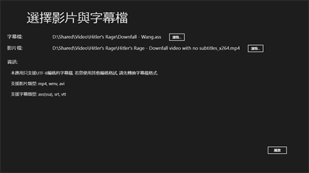這款應用程式是一個非常簡便的外掛字幕影片播放機。使用者可以從其他來源選擇字幕檔來觀看的影片或從事其他目的。目前支援"mp4、wmv、avi"的影片格式和"ass、ssa、srt、vtt"的字幕格式